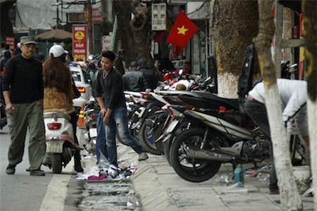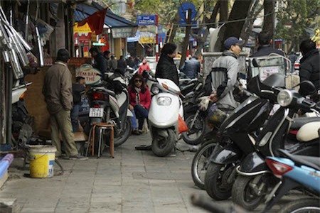 Vỉa hè phố Phủ Doãn trở thành nơi sửa xe máy, chắn ngang vỉa hè. |