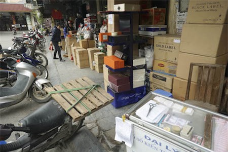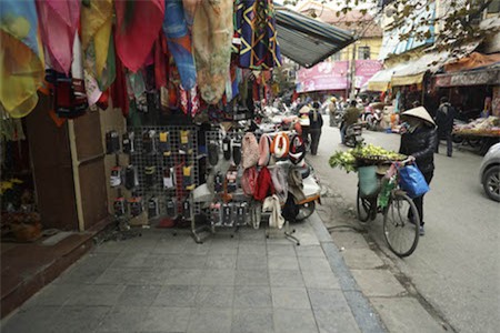 Một người đi bộ đang cố lách qua các loại hàng hóa để đi tiếp trên vỉa hè phố Hàng Buồm |