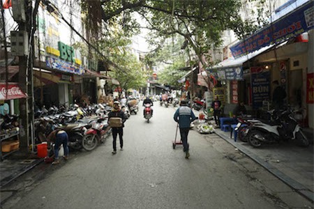 Vỉa hè phố Ngõ Trạm đối diện chợ Hàng Da. |