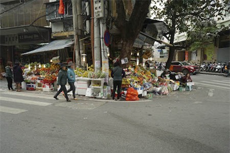 Toàn bộ vỉa hè góc phố Hàng Da - Ngõ Trạm bị chiếm làm nơi bán hoa quả. |