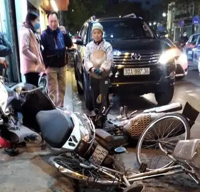 Theo thông tin ban đầu, khoảng 19h tối 11/1, chiếc ô tô 7 chỗ hiệu Toyota Fortuner đang di chuyển trên phố Thái Thịnh (phường Trung Liệt, quận Đống Đa) bất ngờ mất lái tông vào nhiều xe máy.