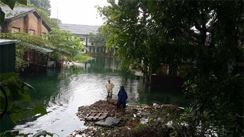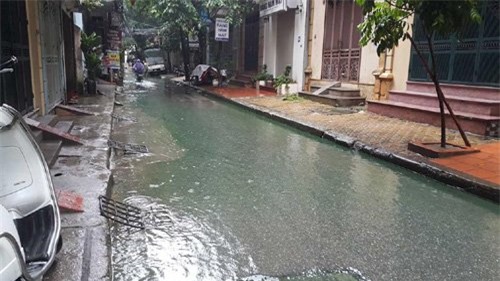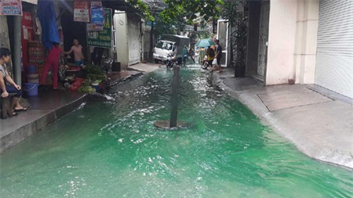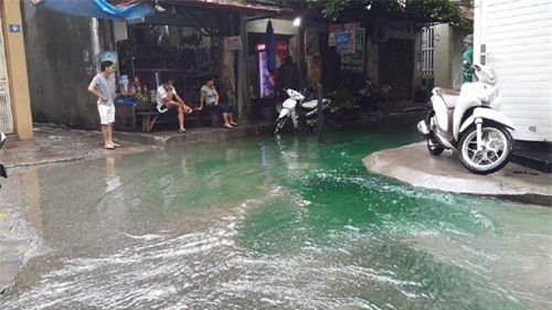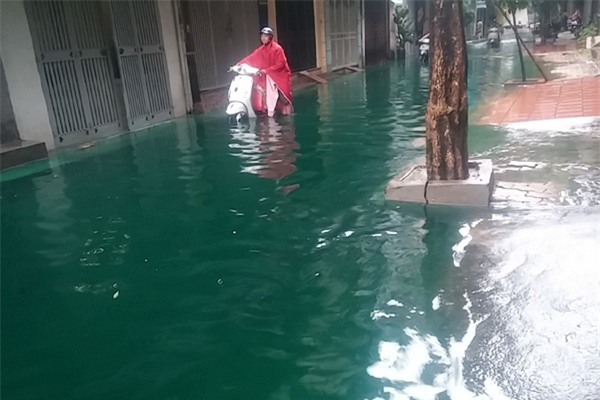 Cả con ngõ dài ở số 87 Tam Trinh, Hoàng Mai, Hà Nội, sau cơn mưa lớn từ hôm qua, nước ngập sâu ngõ. Kỳ lạ là cả dòng nước này mang màu xanh.