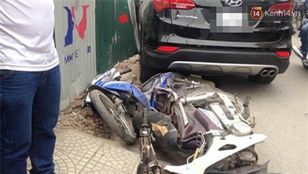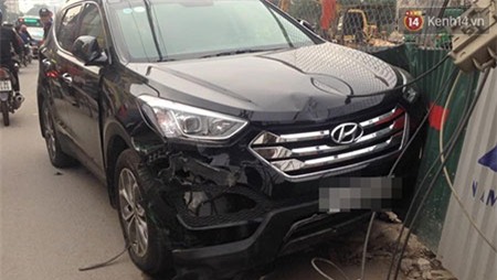 Tại hiện trường, chiếc Santafe gây tai nạn bị hư hỏng phần đầu, xe taxi bị bong một mảng lớn bên sườn phải. Hai chiếc xe máy nằm phía sau gầm xe Santafe cũng bị hư hỏng nặng.