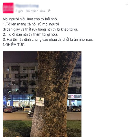 Bạn Hoàng Huy hiện đang sinh sống tại nước ngoài chia sẻ: "Tưởng niệm hàng cây xanh đang bị đốn hạ ở Hà Nội... Mong những người yêu Hà Nội sớm vượt qua nỗi đau này, còn mình, thì hung tin này đồng nghĩa với mất đi thêm một lý do để trở về Hà Nội. Giờ ta nên "khoe" Hà Nội có gì, có Lotte, có Keangnam ah, hay có KFC, có Starbucks???