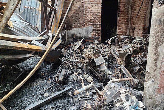Cửa sắt biến dạng, nhiều xe đạp, xe máy cháy trơ khung là những gì còn sót lại sau vụ cháy ngôi nhà 3 tầng ở phố Trung Kính, phường Trung Hòa (quận Cầu Giấy, Hà Nội).