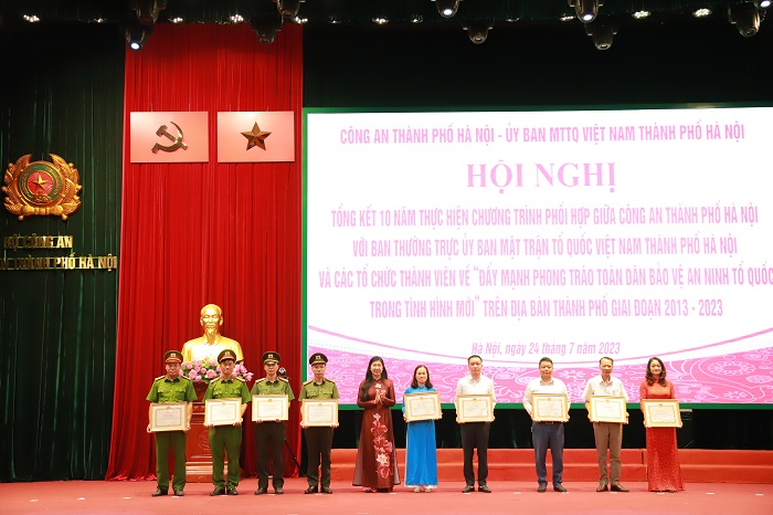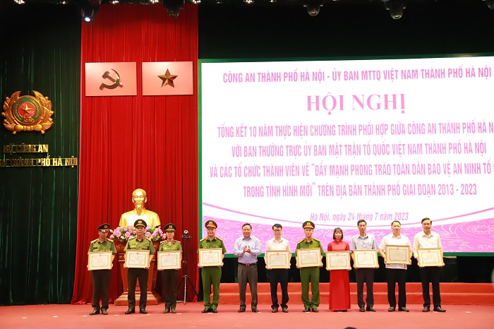 Nhân dịp này, Lãnh đạo UBND thành phố Hà Nội và Giám đốc Công an Thành phố đã khen thưởng cho nhiều tập thể, cá nhân có thành thành xuất sắc trong thực hiện Chương trình phối hợp về “Đẩy mạnh phong trào toàn dân bảo vệ an ninh Tổ quốc trong tình hình mới” trên địa bàn Thành phố, giai đoạn 2013 - 2023.
