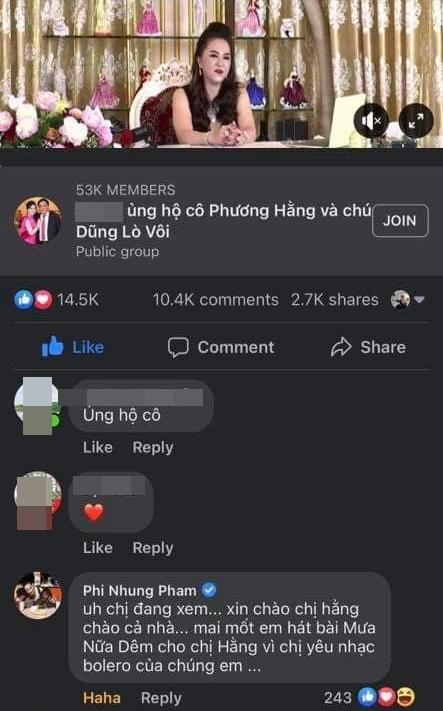 "Chị đang xem... xin chào chị Hằng, chào cả nhà. Mai mốt em hát bài 'Mưa Nửa Đêm' và bài 'Một lần Dang Dở' tặng cho chị Hằng vì chị yêu nhạc bolero của chúng em...", Facebook có dấu tick xanh của Phi Nhung để lại bình luận.
