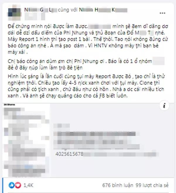"Chị báo công an hộ nha chị Phi Nhung ơi. Báo là có một ổ ở đây núp lùm làm trò đê tiện. Hình như lúc sáng là lần cuối cùng chúng mày report được đó, tao chỉ thử nghiệm thôi. Chiều tao lấy 4 - 5 nick có tick xanh chơi với chúng mày. Đi clone thì phải có tick xanh nhé, đâu như mấy dạng cô hồn. Nhà anh được cái có hơi bị nhiều tick xanh luôn. Và anh sẽ chạy quảng cáo cho cả Facebook biết luôn", người này nhắn nhủ Phi Nhung.
