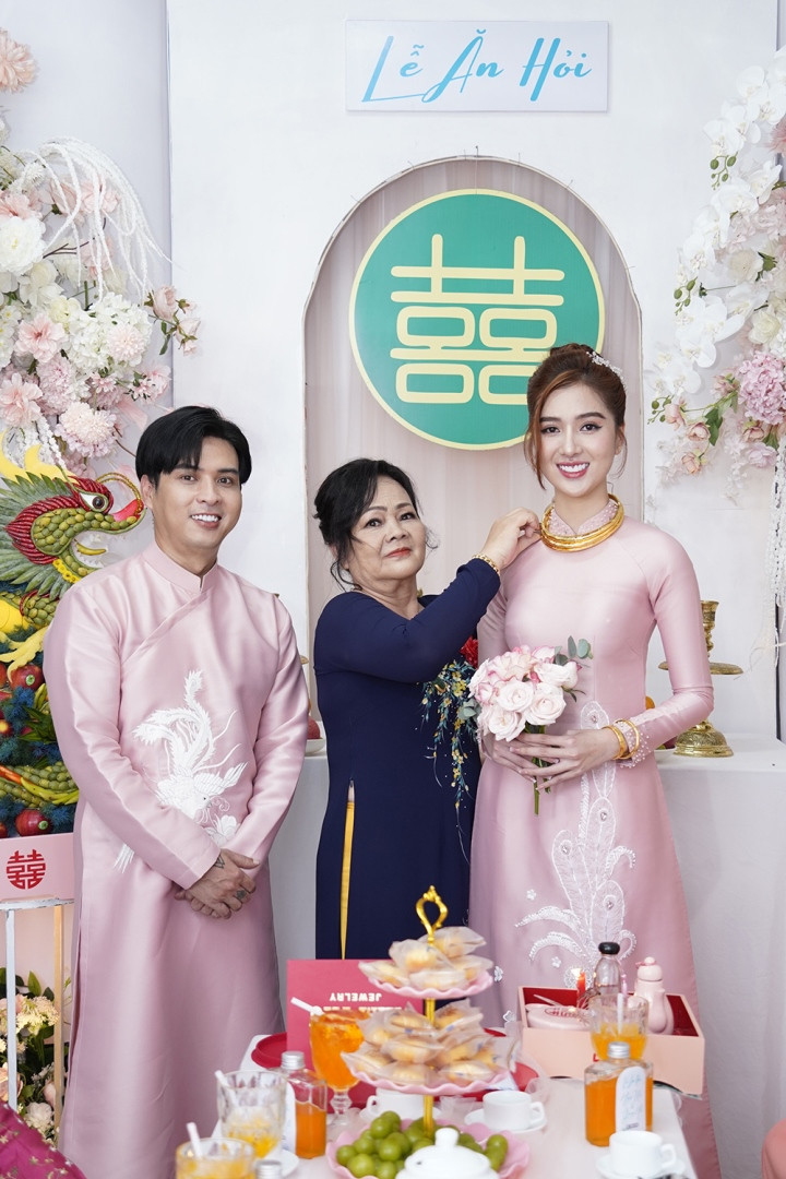 Cô dâu Tuệ Như được cả mẹ chồng và mẹ vợ trao quà cưới là vòng vàng.Trước đó tại lễ ăn hỏi được tổ chức hồi tháng 8 năm 2023, Hồ Quang Hiếu - Tuệ Như cũng diện trang phục áo dài truyền thống màu hồng ngọt ngào. Trong ngày vui, nam ca sĩ lộ rõ sự rạng rỡ, hạnh phúc. Về phần mình, cô dâu Tuệ Như gây ấn tượng với visual xinh đẹp, rạng rỡ. Dù cách nhau 17 tuổi, thế nhưng Hồ Quang Hiếu và Tuệ Như được nhận xét là đẹp đôi. Tại buổi lễ, cô dâu cũng nhận được nhiều quà tặng giá trị. Hai bà thông gia lần này lựa chọn áo dài theo sở thích. Dù không trang điểm hay làm tóc quá cầu kì nhưng mẹ cô dâu và chú rể vẫn được khen đẹp mặn mà.