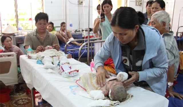 Còn cháu Vương Quốc Đạt (40 ngày tuổi) trước đó có khóc, uống được ít sữa nhưng bị nhiễm trùng nặng. “Dù được đưa xuống TP HCM để chữa trị nhưng tình trạng sức khỏe của 2 cháu ngày càng xấu đi”, bà Hương nói.