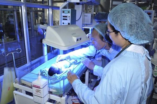 Các bác sĩ đang tiến hành chăm sóc trẻ sinh non tại khoa Nhi.