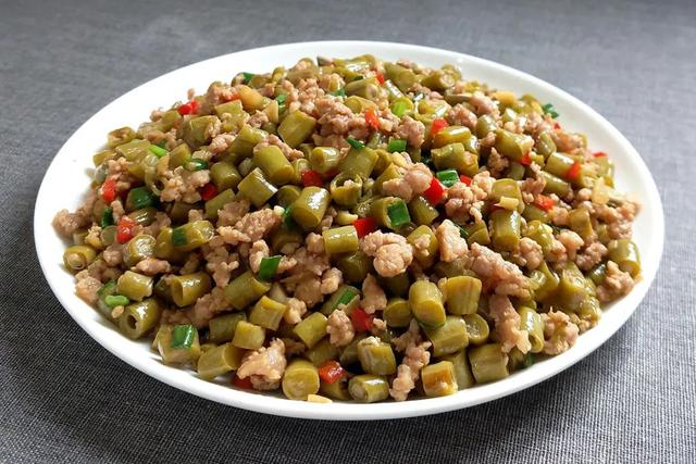 Đun nóng dầu ăn, cho hành tỏi vào phi thơm. Cho thịt băm vào đảo đều. Khi thịt đổi màu thì cho đậu đũa và ớt sừng cắt nhỏ vào. Nêm nếm gia vị cho vừa miệng, sau đó rắc hành lá cắt nhỏ lên trên. Tắt bếp và trút ra đĩa.