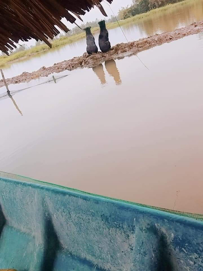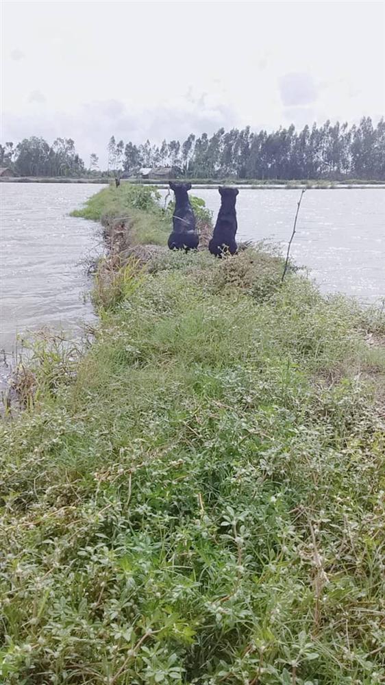 Bức ảnh chó canh đầm tôm được cô chụp vào sáng hôm nay (17/7). Hai chú chó ngồi mãi ở đấy cho đến khi mưa to gió lớn mới chạy vào trú.
