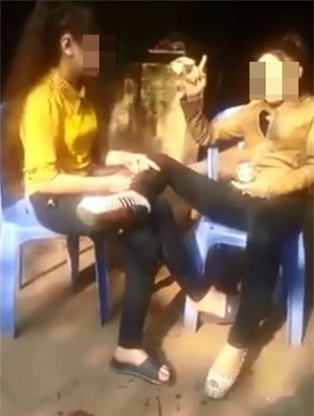 2 cô gái cầm điếu cày và rít thuốc rất chuyên nghiệp. Ảnh cắt từ clip |