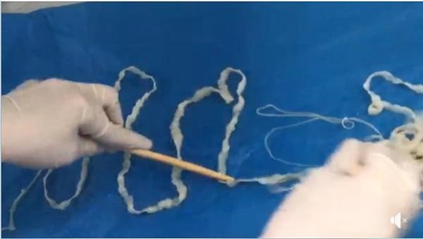 Hình ảnh sán dây dài 5,2 mét sau khi được bác sĩ đưa ra ngoài cơ thể cô gái trẻ.