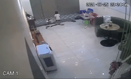 Theo những gì clip ghi lại, vào khuya muộn 25/7 vừa qua, có 2 cháu nhỏ chơi đùa một mình dưới tầng 1, còn một người phụ nữ ra về đứng ngoài cửa nên 2 cháu nhỏ ra chào và cửa cuốn được hạ xuống.
