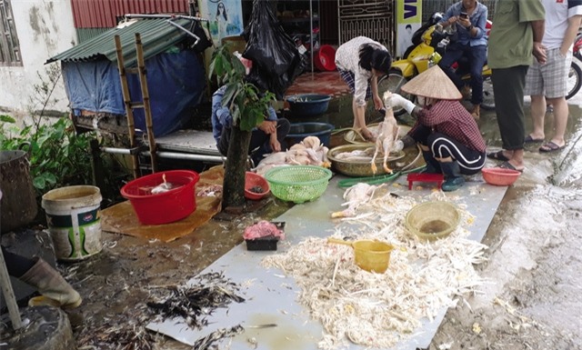 Chỗ để cắt tiết gia cầm được đặt ngay bên cạnh gốc cây rất bẩn, những bát tiết sau khi cắt ra thì được đặt ngay dưới nền, ruồi nhặng bâu khắp nơi. Vịt ngan thì được đặt trên tấm bìa cứng để vặt lông chứ gà thì bị để ngay ở dưới nền gạch để vặt lông vì sợ lông gà lẫn vào với lông vịt. Lông vịt sau khi vặt được các lò mổ gom lại để bán cho những người có nhu cầu thu mua. Quanh khu vực này bốc mùi hôi tanh nồng nặc khiến người đi qua khó chịu.