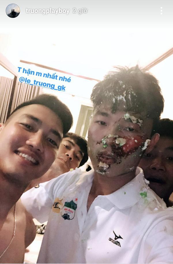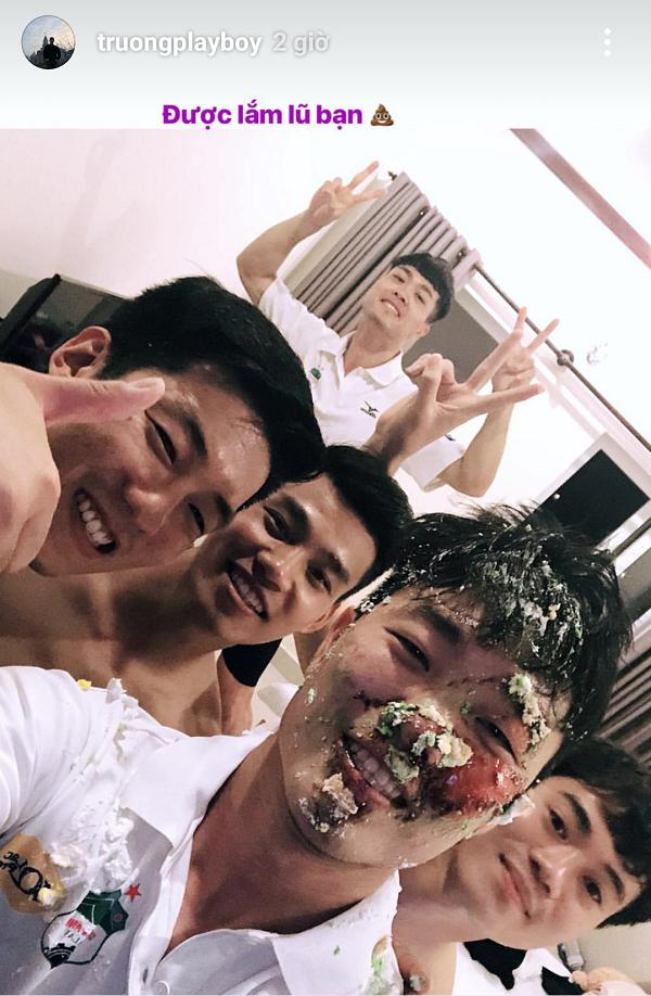 Chân sút họ Lương còn đăng tải bức ảnh gương mặt lấm lem bánh kem trên trang cá nhân.
