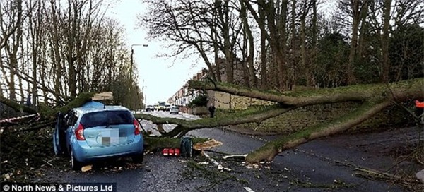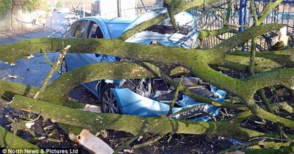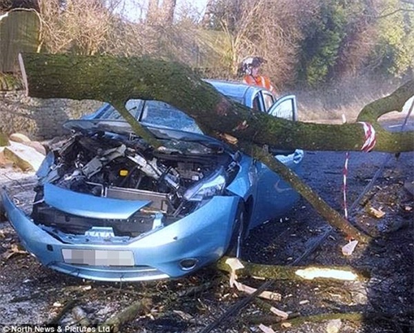 Chiếc xe của hai mẹ con cô Susan McKay bị cây đổ đè trúng.
