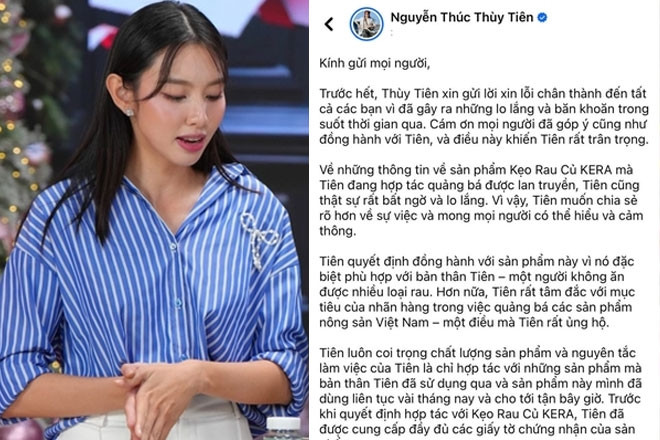 Sau khi kết thúc sự kiện tại quốc tế, Thùy Tiên đã lên tiếng xin lỗi khán giả, khẳng định rằng cô đã làm việc với các cơ quan chức năng và các bên liên quan để làm rõ sự việc. Cô cũng cam kết sẽ hợp tác với nhà sản xuất nếu có bất kỳ vấn đề gì liên quan đến chất lượng sản phẩm. Tuy nhiên, sự "thay đổi" trong lời tuyên bố của Thùy Tiên lại một lần nữa khiến khán giả không hài lòng. Trong bài đăng vào ngày 12/12/2024, Thùy Tiên gọi viên kẹo rau Kera là "đứa con tinh thần đầu tiên". Đến bài đăng xin lỗi vào ngày 6/3/2025, Thùy Tiên nhấn mạnh mối quan hệ của mình và sản phẩm Kẹo rau củ Kera là "hợp tác quảng bá". Có lẽ chỉ riêng về mặt ngữ nghĩa cũng đủ thấy chỉ sau gần 3 tháng mối quan hệ của Thùy Tiên và sản phẩm Kẹo rau củ Kera này đã từ "người thân" thành "người hợp tác".