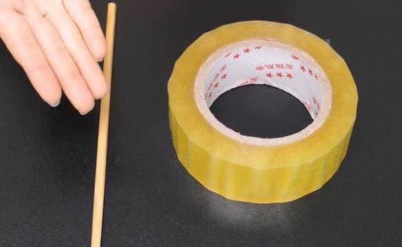 Bước 1: Đầu tiên bạn chuẩn bị một cuộn băng dính scotch và một chiếc đũa ăn, dù là cuộn băng keo lớn hay băng keo nhỏ thì bạn hãy xé nhỏ miếng băng dính scotch trước.