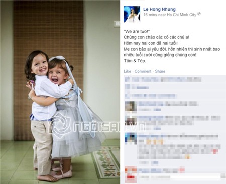 Hôm nay, hai nhóc Tôm và Tép vừa tròn 2 tuổi, trông hai bé rất chững chạc và đáng yêu. Mẹ Hồng Nhung chia sẻ nụ cười yêu đời, hồn nhiên trên gương mặt của hai bé cùng dòng chia sẻ đầy mãn nguyện: "We are two! Chúng con chào các cô các chú ạ! Hôm nay hai con đã hai tuổi! Mẹ con bảo ai yêu đời, hồn nhiên thì sinh nhật bao nhiêu tuổi cười cũng giống chúng con! Tôm & Tép."