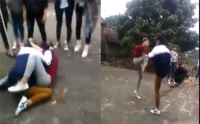 Trên đường đi học về, 2 nữ sinh TTGDTX huyện Chương Mỹ đã lao vào đánh nhau. (Ảnh: Cắt từ clip)