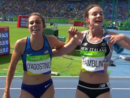 Cùng chấn thương sau khi ngã vấp ở vòng loại chạy 5000m, Abbey D'Agostino (Mỹ) và Nikki Hamblin (New Zealand) đã ở lại để giúp đỡ nhau và cùng về đích cuối cùng.