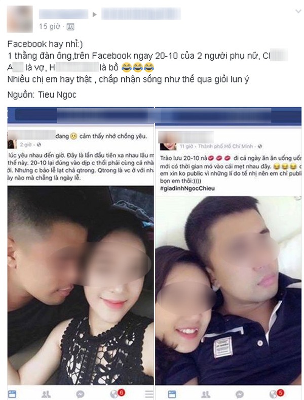 Quả đúng là cứ mỗi lần đến dịp lễ Tết, thế nào mạng xã hội cũng rầm rĩ đủ thứ chuyện. Trước và trong 20/10 vừa qua, chị em tranh nhau khoe quà được chồng hoặc bạn trai tặng, đến nỗi 1 xấp tiền với mẩu giấy nhắn của ông chồng nọ có đến mấy chục bà vợ nhận là của mình, đi vào huyền thoại luôn (!) Tuy nhiên, mấy màn khoe quà cướp quà ấy vẫn chưa là gì so với câu chuyện kỳ cục nhất quả đất vừa xảy ra: một ông chồng xuất hiện trong 2 bức ảnh khác nhau, bên cạnh… 2 người phụ nữ cùng xưng là “vợ”, khiến mọi người hoang mang thắc mắc.