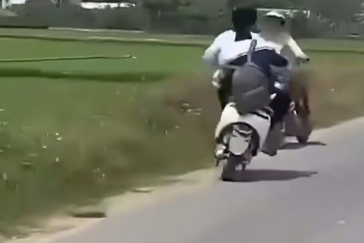 Cả hai người đi trên xe máy mang biển kiểm soát 14K1-161.34, di chuyển với tốc độ cao, đều mặc quần ngắn và áo khoác, không đội mũ bảo hiểm. Đáng chú ý, người điều khiển xe còn khoanh chân lên yên xe, trong khi người ngồi sau ôm búp bê và liên tục dùng áo che mặt.