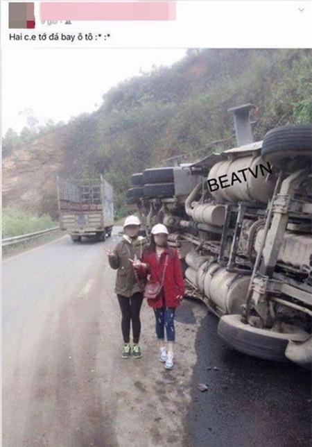 Bức ảnh được chia sẻ trên mạng xã hội ngày 11/11 ghi lại sự vô cảm của hai cô gái khiến họ nhận phải sự chỉ trích gay gắt của cộng đồng mạng. Theo đó, bức ảnh được chia sẻ trên trang cá nhân của cô gái có nickname C.N với nội dung: "Hai chị em tớ đá bay ô tô". Trong bức ảnh, hai cô gái còn khá trẻ đang giơ tay chữ V, chụp ảnh bên một chiếc xe tải bị lật nghiêng giữa đường, dầu đổ lênh láng.