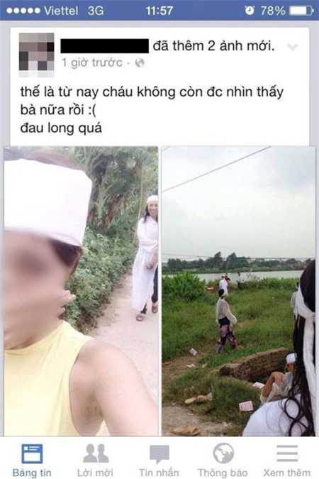 Trước đó, một thiếu nữ chụp ảnh "tự sướng" trong đám tang người bà của mình sau đó khoe trên facebook cũng khiến rất nhiều người phẫn nộ. Ngay trong đám tang của bà mình, cô gái thản nhiên check in Facebook, chụp ảnh tự sướng kèm theo dòng status đau buồn: "Thế là từ nay cháu không còn được nhìn thấy bà nữa rồi. Đau lòng quá".