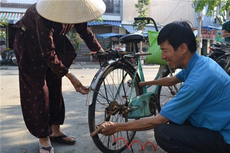 Hai thương binh, người bị cụt tay phải, người bị cụt chân phải nhưng suốt những năm qua, họ vẫn bám víu nơi vỉa hè sửa xe mưu sinh.