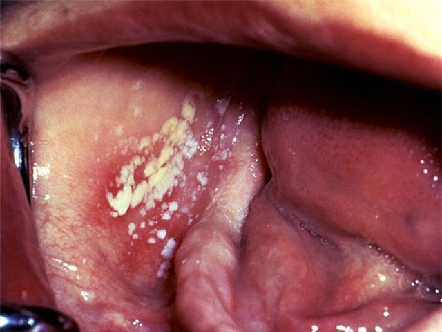 Biểu hiện đặc trưng của bệnh nấm miệng là những vết màu trắng thường xuất hiện trên lưỡi hoặc bên trong má.