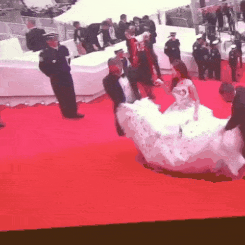 Cũng chính vì phần tùng váy xòe rộng và nặng nên khiến việc di chuyển của Jessia trên thảm đỏ có chút vất vả, cô phải nhờ tới 2 người phụ tá đỡ váy và dìu tay khi bước đi.