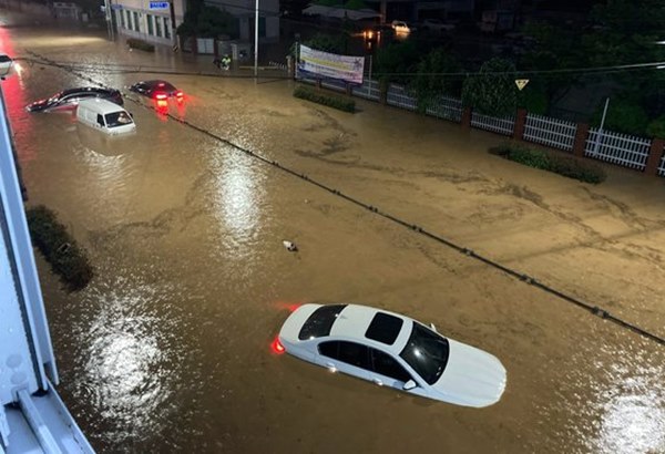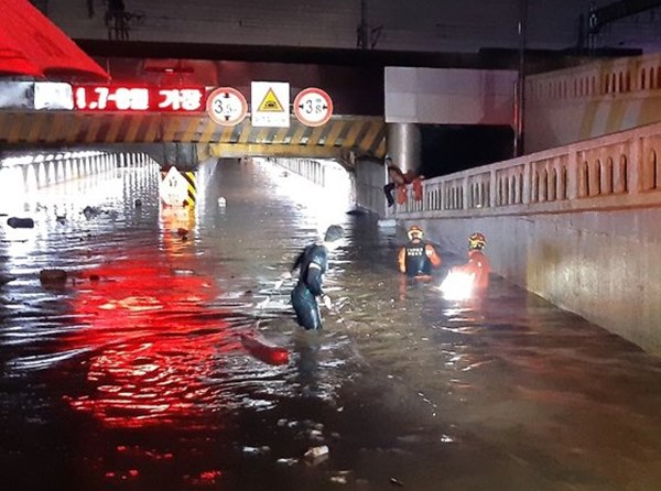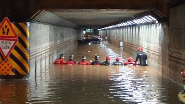 Nhân viên cứu hộ đang làm nhiệm vụ ứng cứu tại đường hầm Choryang bị ngập sau trận mưa lớn trút xuống Busan, khu vực 2 mẹ con bà Kim gặp nạn.