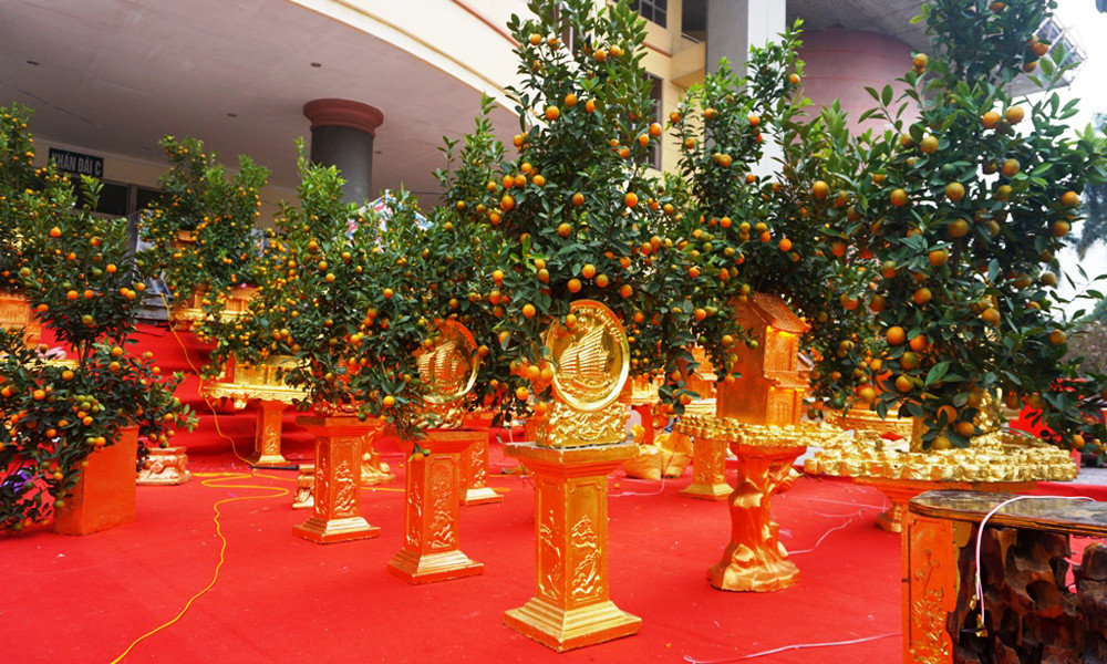 Ghi nhận tại chợ hoa xuân Tết Giáp Thìn 2024, tổ chức tại TP. Ninh Bình (Ninh Bình), có hàng trăm gian hàng bày bán đủ các loại đào, quất, bưởi, hoa lan... Gây chú ý nhất với du khách và người dân khi đến tham quan, mua sắm ở chợ là những chậu cảnh, cây bưởi với hàng chục quả được dát vàng.