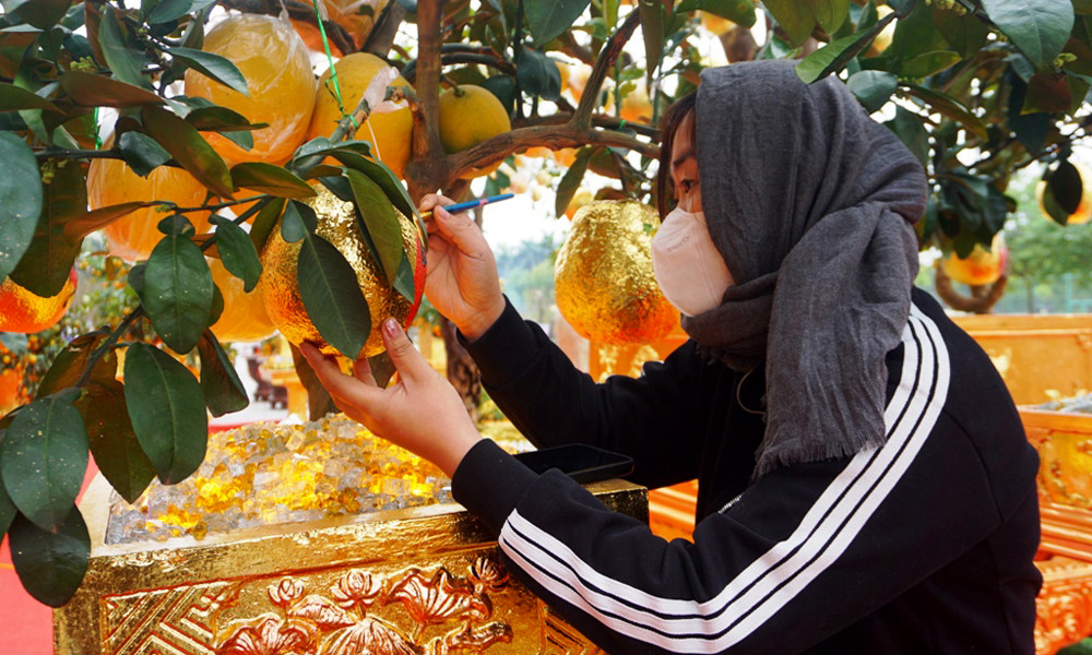 Năm nay, anh cũng nhập gốc cây bưởi Diễn về dát thêm vàng lên quả, chậu, thuê họa sĩ vẽ trang trí để bán ra thị trường.