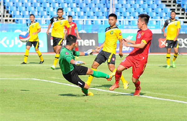Với lực lượng nhỉnh hơn, U23 Việt Nam dồn lên tấn công ngay từ đầu. Phút thứ 3, đội bóng áo đỏ đã suýt chút nữa có bàn mở tỉ số. Phi Sơn đi bóng rồi bất ngờ tung cú dứt điểm căng từ ngoài vòng cấm, buộc thủ thành Mohd HJ Mohd phải bay người cản phá.