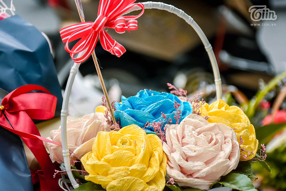 Khách đông song theo ghi nhận, giá các loại hoa chỉ tăng nhẹ. Hoa hồng 15k/ bông đã có đóng gói. Các giỏ quà hoa cũng có giá linh động, từ 30k lên đến vài trăm.