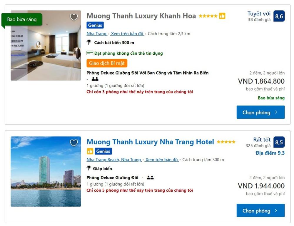 Nếu đặt khách sạn Mường Thanh Khánh Hòa (Khánh Hòa) từ 15-17/5, số tiền bạn phải trả cho phòng 2 người lớn chỉ chưa đến 1,9 triệu đồng. Cùng thời điểm này, một số khách sạn 5 sao khác như Majestic Premium hay Ariyana SmartCondotel Nha Trang... cũng chỉ có giá trên dưới 2,7 triệu đồng.