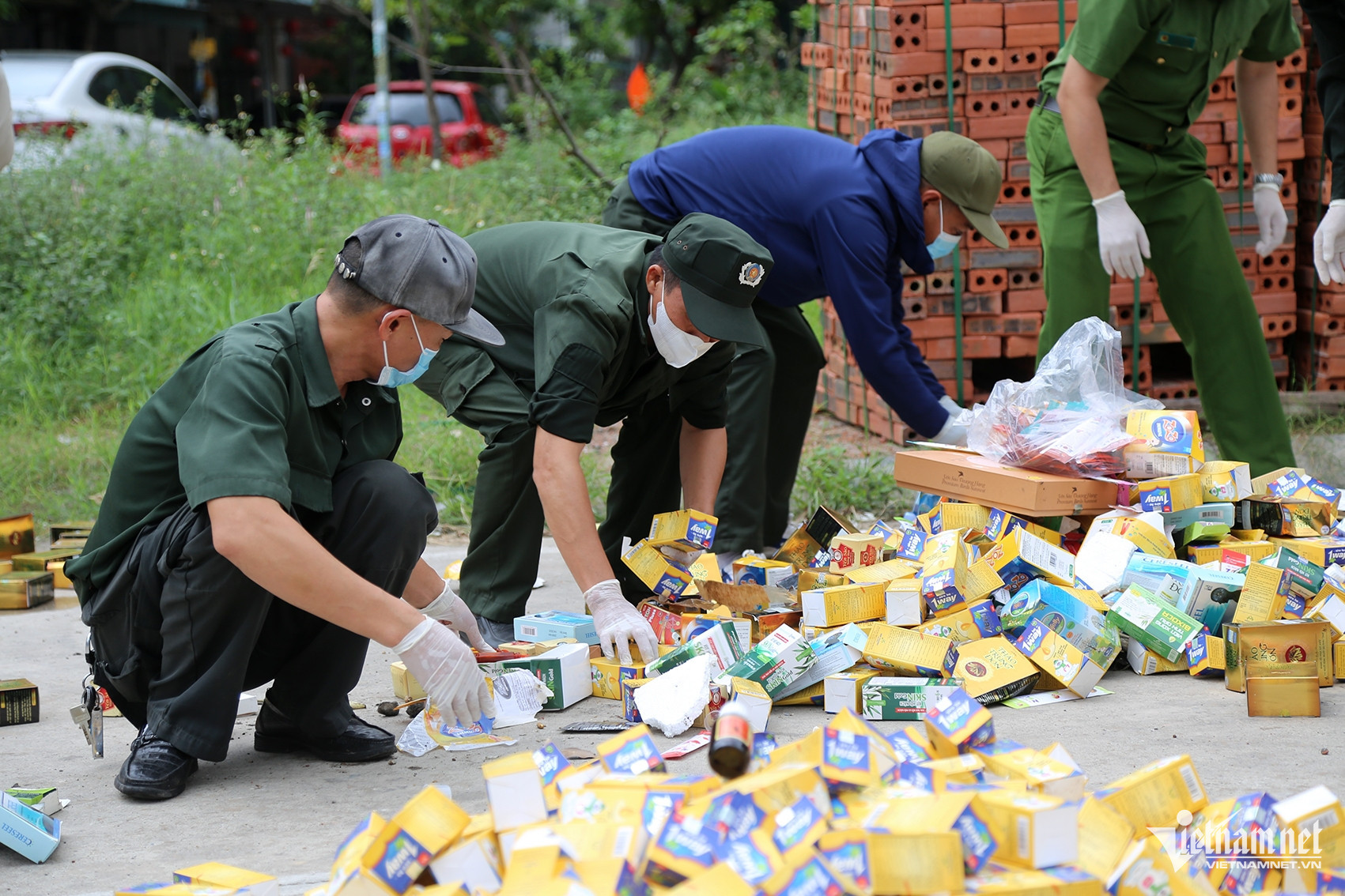 Ghi nhận tại hiện trường, hàng nghìn hộp thực phẩm chức năng được thu gom chất đầy 13 xe chở rác để chờ lực lượng chức năng tới kiểm tra.