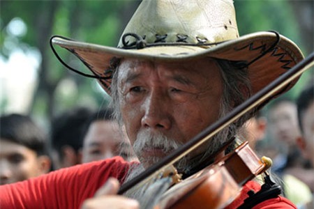 Nghệ sĩ đường phố chơi bản nhạc Hồn tử sĩ để tưởng nhớ Đại tướng. |