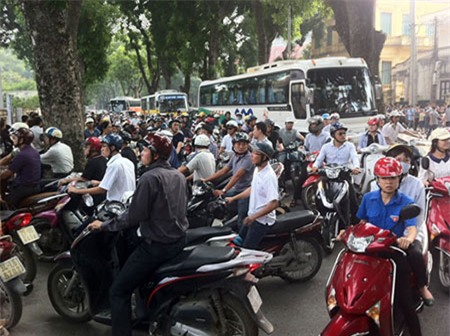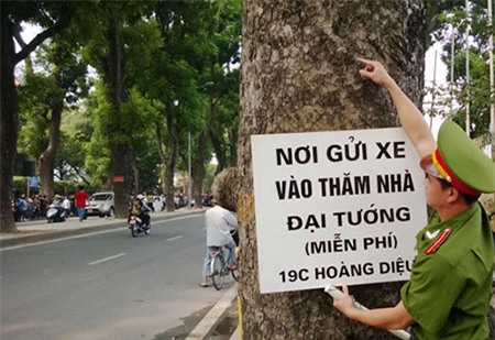 Lối vào khu để xe tắc kín. Sau những lượt đầu tiên đi ra, hàng trăm người vẫn chờ đợi đến lượt gửi xe để vào thăm nhà Đại tướng. |
