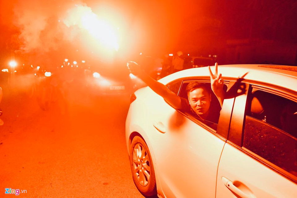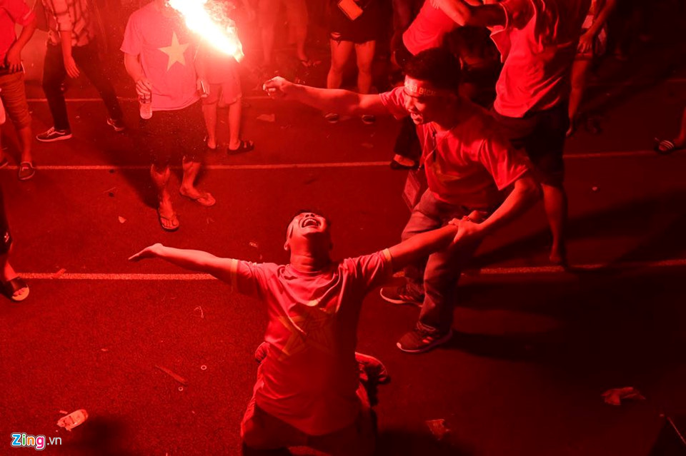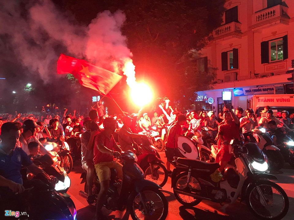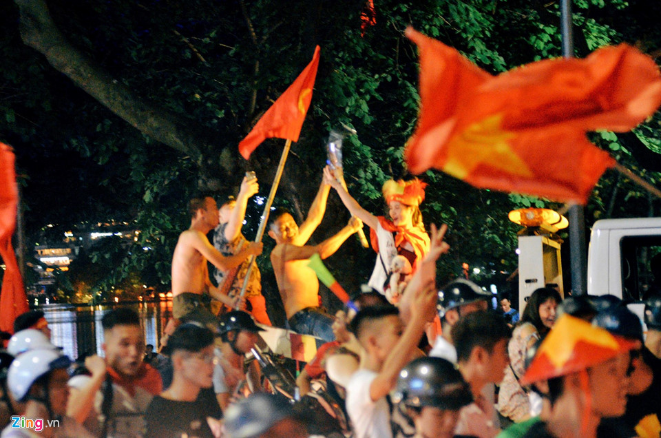 | Hơn 22h, hàng trăm người đổ ra khu vực hồ Hoàn Kiếm ăn mừng. |