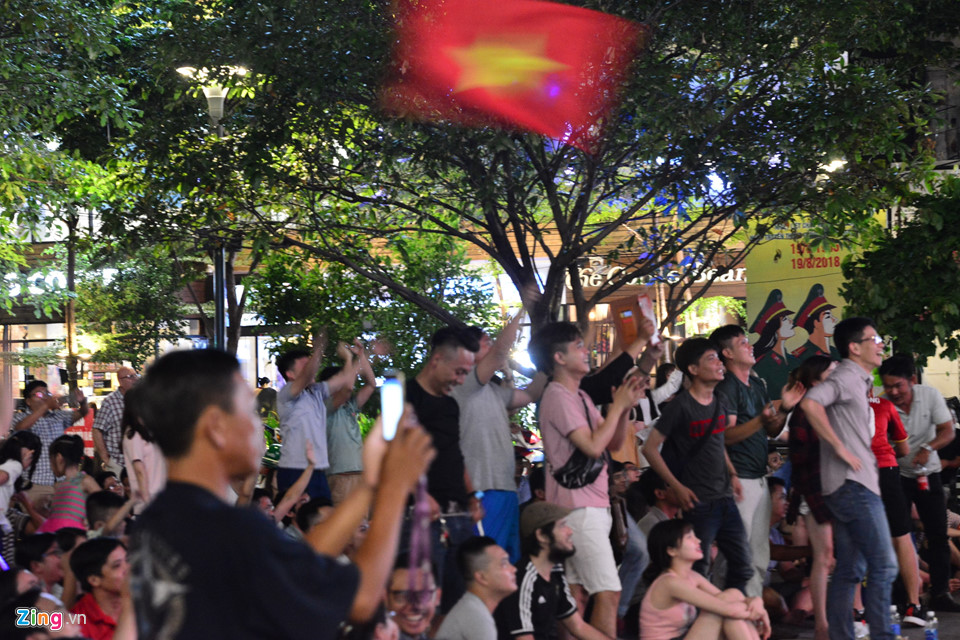 | Tại TP.HCM, người dân hò reo, vẫy cờ ở phố đi bộ Nguyễn Huệ khi trận đấu vừa kết thúc. |