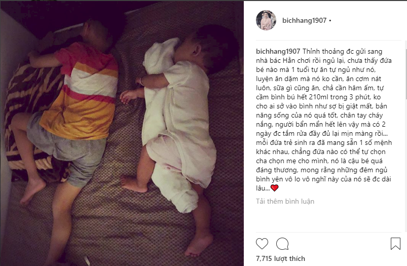 "Thỉnh thoảng được gửi sang nhà bác Hằng chơi rồi ngủ lại, chưa thấy đứa bé nào mà 1 tuổi tự ăn tự ngủ như nó, luyện ăn dặm mà nó không cần, ăn cơm nát luôn, sữa gì cũng ăn, chả cần hâm ấm, tự cầm bình bú hết 210ml trong 3 phút, không cho ai sờ vào bình như sợ bị giật mất. Bản năng sống của nó quá tốt, chân tay cháy nắng, người bẩn, mẩn hết lên, vậy mà có 2 ngày được tắm rửa đầy đủ lại mịn màng rồi... Mỗi đứa trẻ sinh ra đã mang sẵn 1 số mệnh khác nhau, chẳng đứa nào có thể tự chọn cha chọn mẹ cho mình, nó là cậu bé quá đáng thương, mong rằng những đêm ngủ bình yên vô lo vô nghĩ này của nó sẽ được dài lâu".