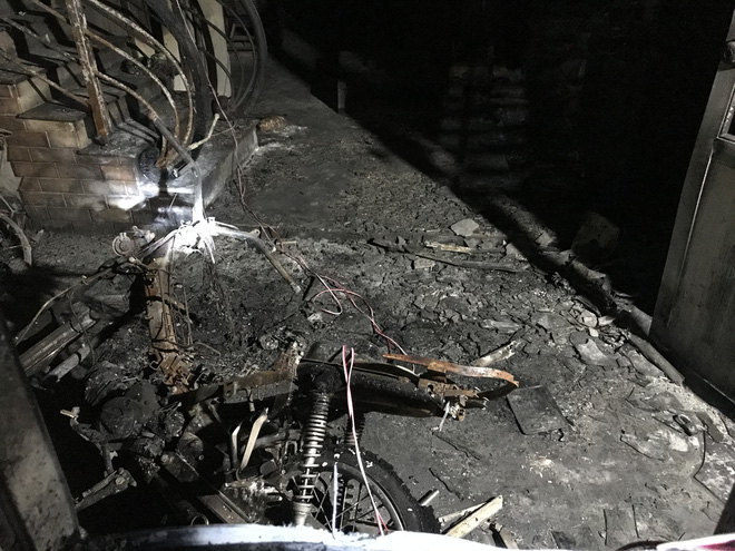 Chiếc xe máy bên trong căn nhà bị ngọn lửa thiêu rụi.
