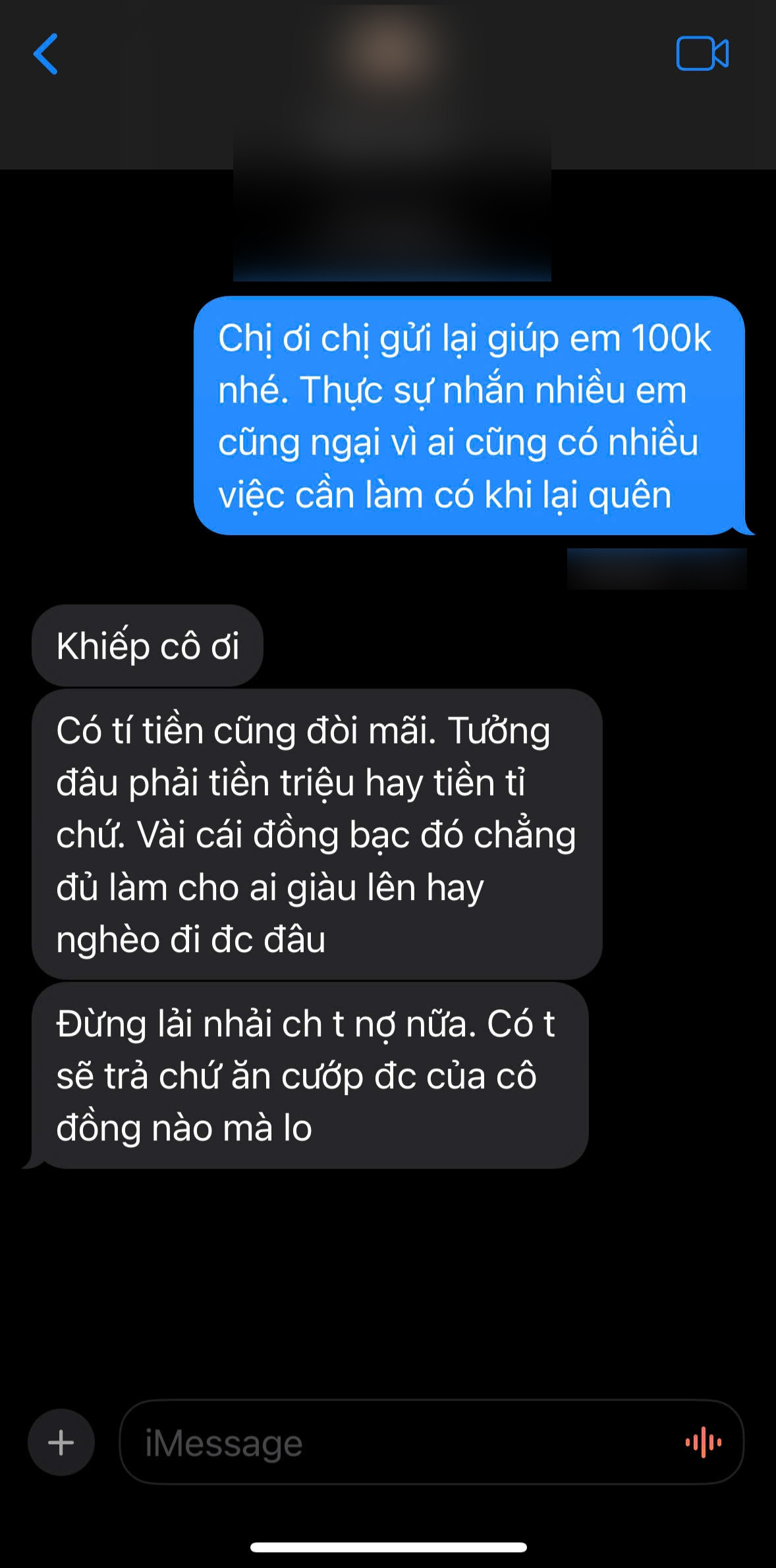 “Có tí tiền cũng đòi, tưởng đâu phải tiền triệu hay tiền tỷ chứ. Vài cái đồng bạc đó chẳng đủ làm cho ai giàu lên hay nghèo đi đâu. Đừng lải nhải chuyện tôi nợ nữa. Có tôi sẽ trả chứ ăn cướp được của cô đồng nào mà lo”, người này nhắn.