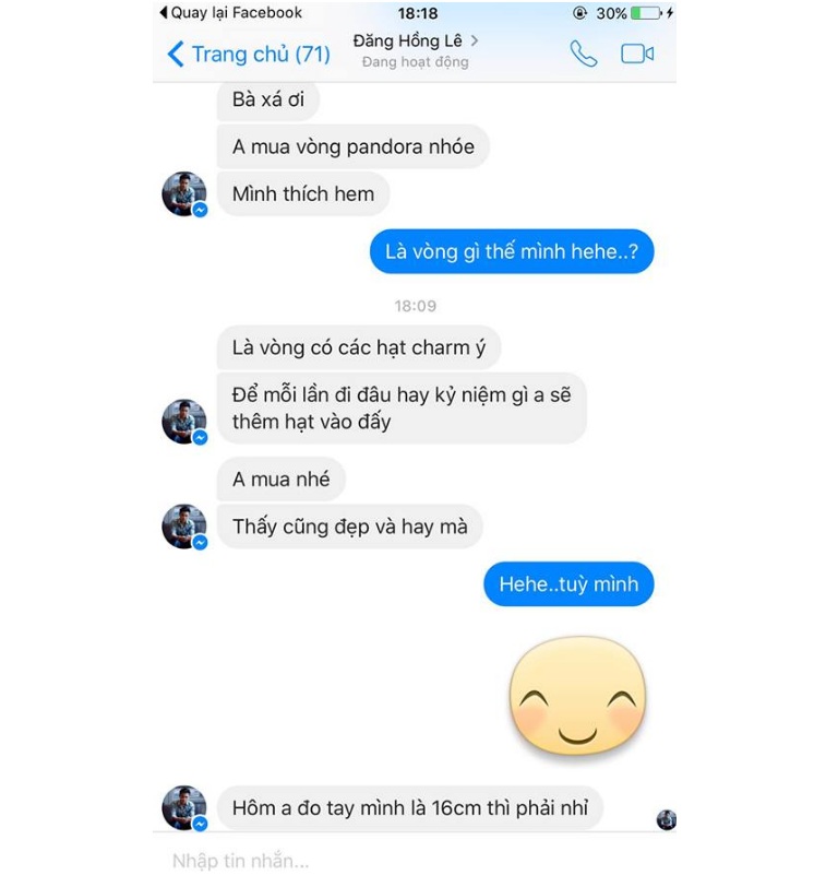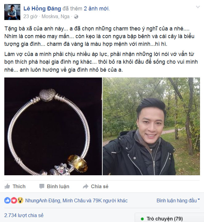 Nội dung anh viết: “Tặng bà xã của anh này... Anh đã chọn những charm theo ý nghĩ của anh nhé... Nhím là con mèo may mắn... còn kẹo là con ngựa bập bênh và cái cây là biểu tượng gia đình... charm đá vàng là màu hợp mệnh với mình...hì hì.